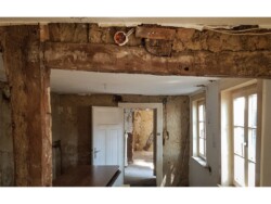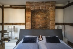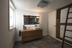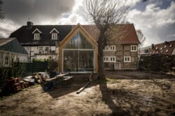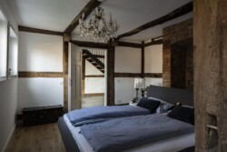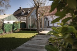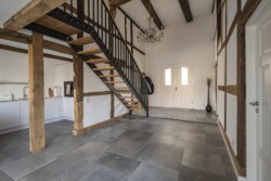 Die Grundidee von Gröne Architektur bestand darin, unter Beibehaltung von Struktur und Konstruktion modernes Wohnen zu ermöglichen. Dieses findet im Wesentlichen auf einer Ebene, dem Erdgeschoss, statt. Im Altbau konnte die ursprüngliche Raumaufteilung weitgehend beibehalten werden. Das Raumprogramm umfasst die zweigeschosshohe Deele, Garderobe, Gästebad, Schlafzimmer mit Ankleide und das Hauptbad. Im Obergeschoss befinden sich ein kleiner Gästebereich sowie die Heizung und ein Hauswirtschaftsraum. Außerdem wurde der baufällige Anbau, der ursprünglich als Schweinestall und später als Abstellfläche genutzt wurde, abgerissen und durch einen modernen Anbau mit großzügigen Glasflächen ersetzt. Aufgrund der Nähe des Grundstücks zur Ems steht der Anbau zum Schutz der Fundamente auf einem 1,5 m hohen Schotterpolster. In der Wand zwischen der Deele im Haupthaus und dem neuen Anbau wurden alle Gefache entfernt, wodurch eine natürliche Fortführung der Deele in den Anbau hinein entsteht, der den Ess- und Wohnbereich umfasst und zusammen mit der Küche das Herzstück des Hauses bildet. Obwohl der Anbau mit 33 m² vergleichsweise klein ist, verleiht er den Wohnräumen durch die offene Konstruktion Helligkeit und großzügige Räumlichkeit.