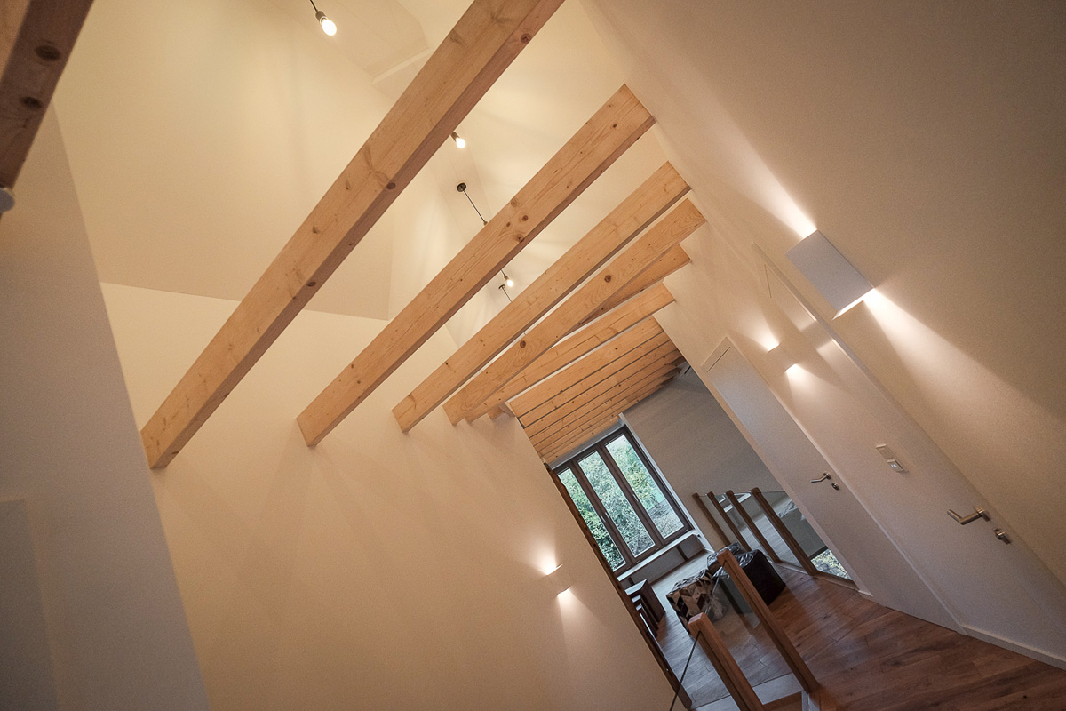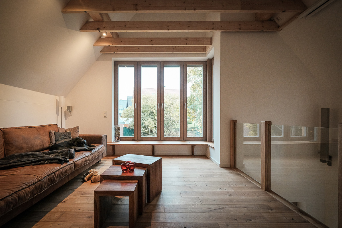 Im Innenraum wird man durch die ungewöhnliche Grundrissstruktur, die sich aus dem Knick ergibt, und Verknüpfungen der Ebenen über zwei Lufträume überrascht. Die ausgeklügelte Raumfolge bringt Weite in dieses mit 140 m² Wohnfläche eher kleine Objekt.