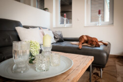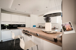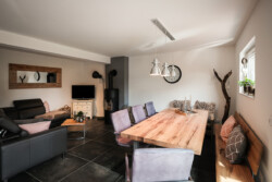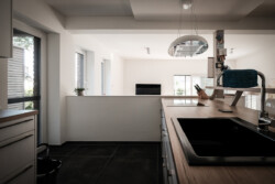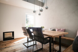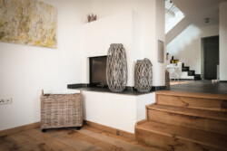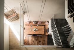Dieser Wunsch nach offenen Räumen welche die Kommunikation fördern würde konsequent umgesetzt. So vernetzt der eindrucksvolle Luftraum alle drei Etagen in Form einer offenen Treppe und verschiedenen Galerie-Ebenen. Das pulsierende Herz des Hauses bildet der Esstisch. Neben dem Spiel mit Lufträumen und extremen Raumhöhen wurden aber auch Plätze des Rückzuges und der Gemütlichkeit geschaffen. So wurde das Wohnzimmer als Rückzugsort leicht nach unten abgestuft. Die warme Atmosphäre, welche der Kamin als verbindendes Element erzeugt, wird durch die Verwendung warmer Materialien wie der Voll-Holz Dielenboden aus sägerauer Eiche unterstützt. Auch praktische Aspekte wie ein späterer Umbau zu barrierefreien Wohnen der zweiten Wohneinheit wurden berücksichtigt.