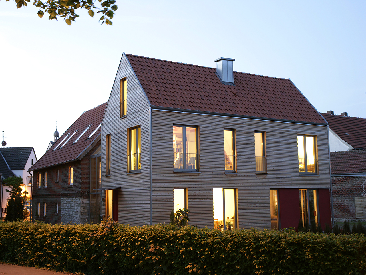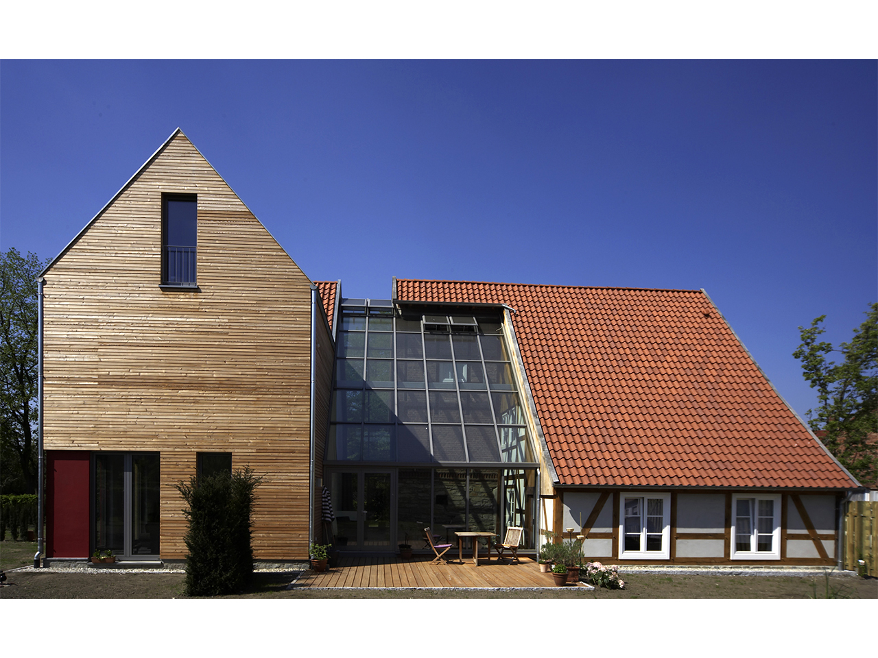 Der Neubau ist ein, über einen transparenten Glasanbau mit dem Bestand verbundener, Holzrahmenbau und zeichnet sich durch eine moderne Architektur aus. Der Glaszwischenbau, trennt die beiden Bauteile optisch und verbindet sie gleichzeitig. So steht der Neubau in angemessenem Abstand zum Baudenkmal und lässt diesem seine Würde. Dort wo Alt und Neu aufeinander stoßen, entstehen reizvolle Zwischenräume. Ein Privileg, das sich mit keinem reinen Neubau erreichen lässt.