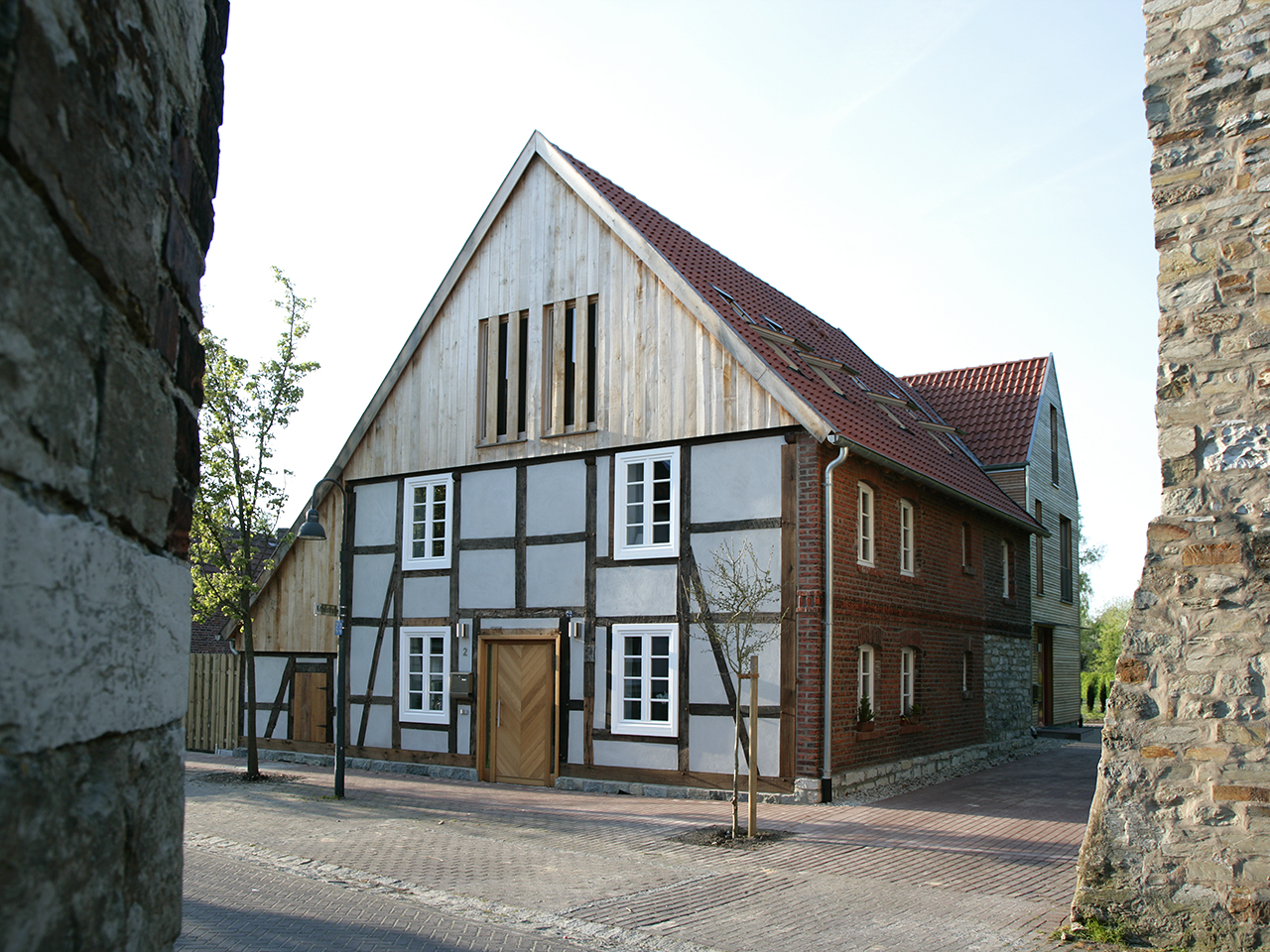 Wie sich Altes und Neues zu einem reizvollen Ensemble verbinden lassen, zeigt dieses Gebäude. Auf dem Gelände der ehemaligen Stadtmauer, im Schatten des Wehrturmes, steht das denkmalgeschützte Fachwerkhaus, das saniert und durch einen modernen Anbau ergänzt wurde.