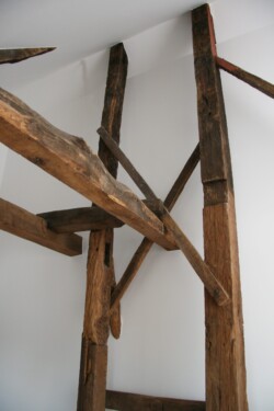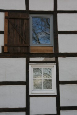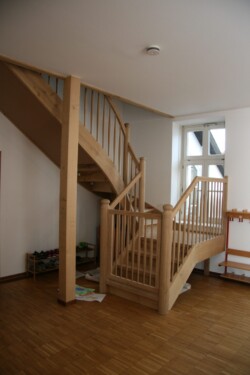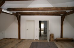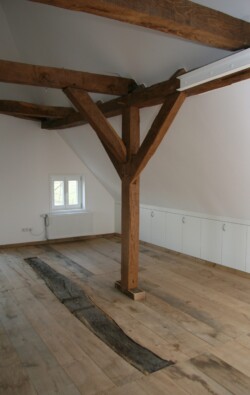 Das denkmalgeschützte Gebäude wurde erstmals im Jahre 1991 von unserem Vater, Architekt Raymund Gröne, zum Kindergarten ausgebaut. Im Rahmen des U3 Ausbaus wurde die Kindertagesstätte in Anreppen den neuen Anforderungen angepasst. Im Erdgeschoss wurde durch kleine Eingriffe ein neuer Ruheraum geschaffen und die Sanitäranlagen angepasst. Das Dachgeschoss wurde zum Büro und Personalraum umgebaut. Dabei konnte die Jahrhunderte alte Holzkonstruktion durch eine klare, moderne Gestaltung der Räume und Wandflächen in Szene gesetzt werden und dieser einzigartige Kindergarten mit einem ebenso einzigartigen Dachraum erweitert werden. Der individuell angefertigte Fußboden besteht aus massiven Eichenbrettern in 2,5cm Stärke. Die Bretter wurden von einem örtlichen Zimmereibetrieb eigens zugeschnitten und gebürstet, sonst sind die Eichenbretter komplett naturbelassen. Die sägerauhe Oberfläche wird im Laufe der Jahre seine ganz eigene Patina entwickeln. So entwickelt sich ein spannungsreiches Spiel zwischen den glatt-weißen Oberflächen der Dachflächen und den warmen, natürlichen Oberflächen der Holzbauteile.