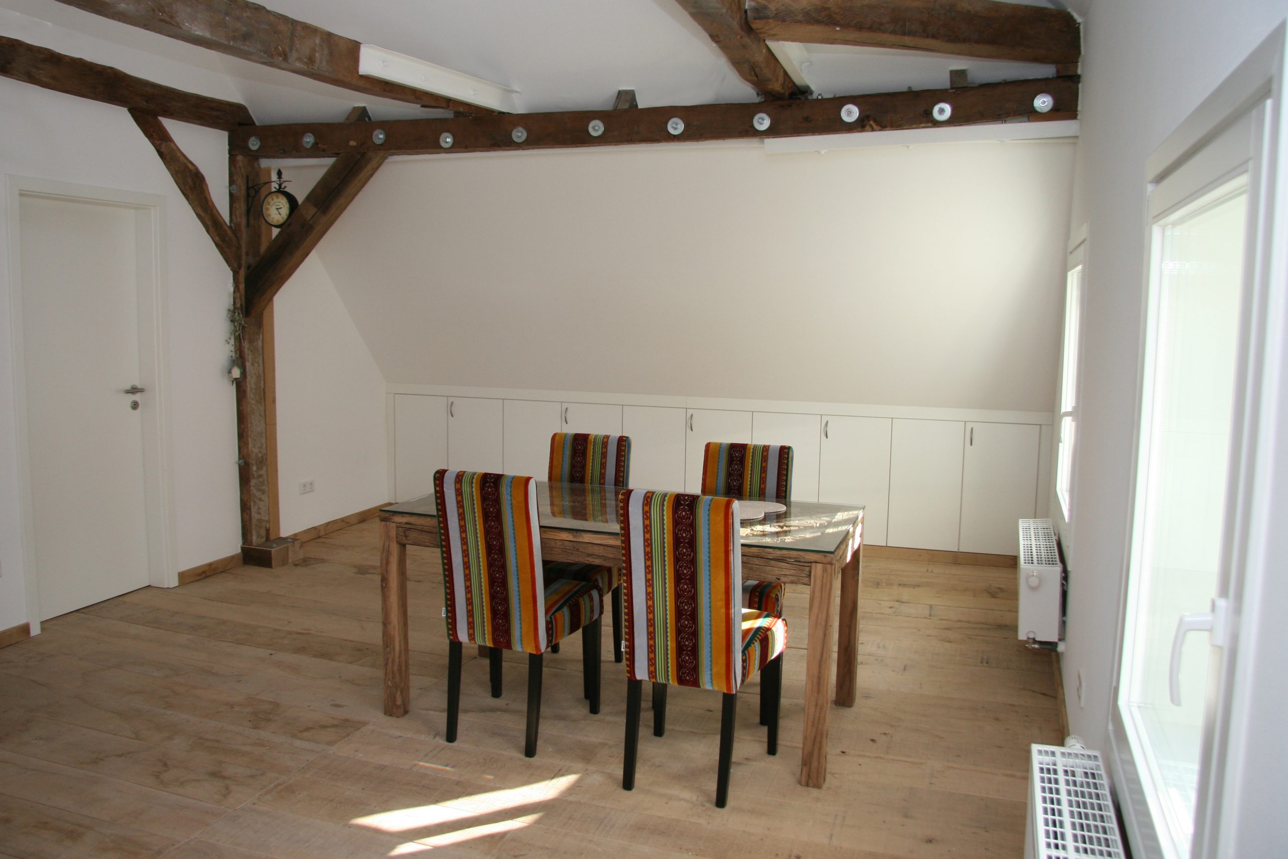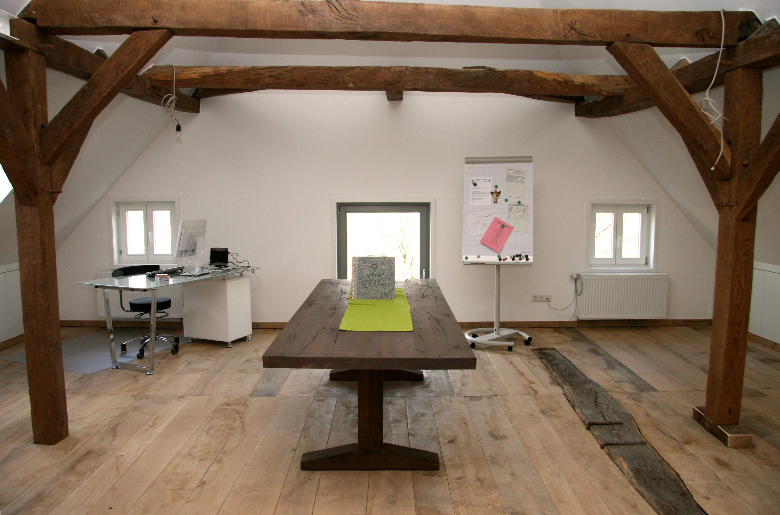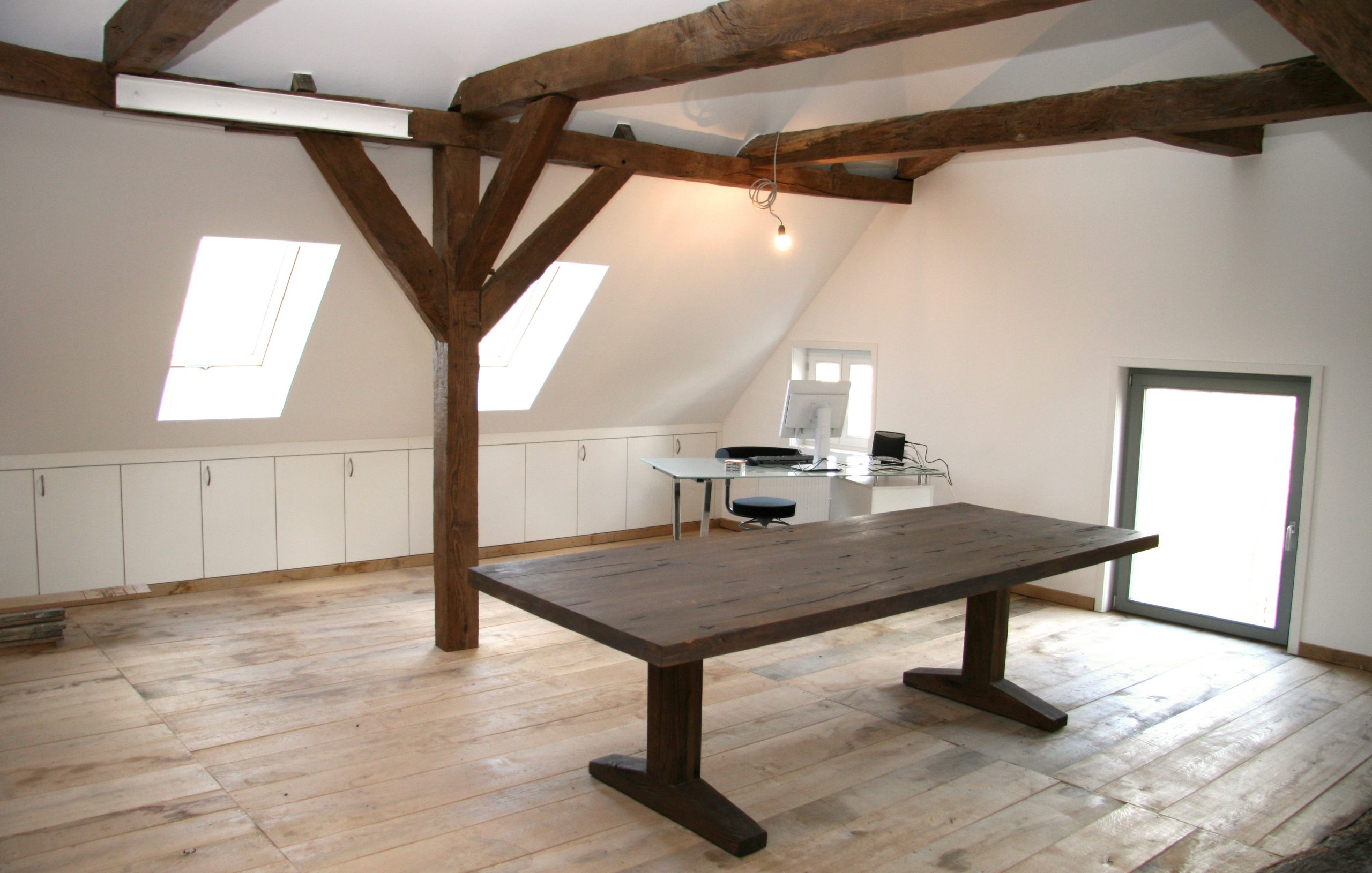 Das denkmalgeschützte Gebäude wurde erstmals im Jahre 1991 von unserem Vater, Architekt Raymund Gröne, zum Kindergarten ausgebaut. Im Rahmen des U3 Ausbaus wurde die Kindertagesstätte in Anreppen den neuen Anforderungen angepasst. Im Erdgeschoss wurde durch kleine Eingriffe ein neuer Ruheraum geschaffen und die Sanitäranlagen angepasst. Das Dachgeschoss wurde zum Büro und Personalraum umgebaut. Dabei konnte die Jahrhunderte alte Holzkonstruktion durch eine klare, moderne Gestaltung der Räume und Wandflächen in Szene gesetzt werden und dieser einzigartige Kindergarten mit einem ebenso einzigartigen Dachraum erweitert werden. Der individuell angefertigte Fußboden besteht aus massiven Eichenbrettern in 2,5cm Stärke. Die Bretter wurden von einem örtlichen Zimmereibetrieb eigens zugeschnitten und gebürstet, sonst sind die Eichenbretter komplett naturbelassen. Die sägerauhe Oberfläche wird im Laufe der Jahre seine ganz eigene Patina entwickeln. So entwickelt sich ein spannungsreiches Spiel zwischen den glatt-weißen Oberflächen der Dachflächen und den warmen, natürlichen Oberflächen der Holzbauteile.