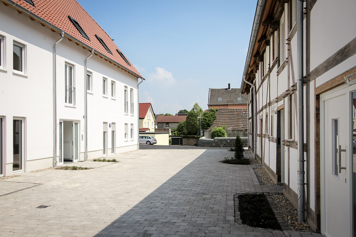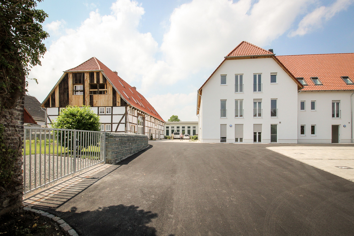 Durch die sensible Einbindung des Neubaus in die vorhandene Struktur entsteht ein neues bauliches Gefüge, das die städtebauliche Situation in diesem Bereich deutlich aufwertet. In der sanierten Fachwerkscheune werden künftig fünf Wohnungen sowie die Sozialstation der Caritas Soest untergebracht. Im Neubau entstehen vier Wohneinheiten im Erdgeschoss, sieben WG-Plätze sowie sieben Mikro-Apartments im Dachgeschoss.