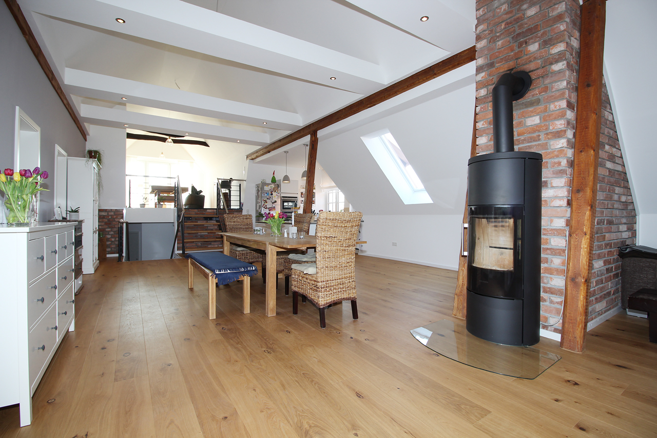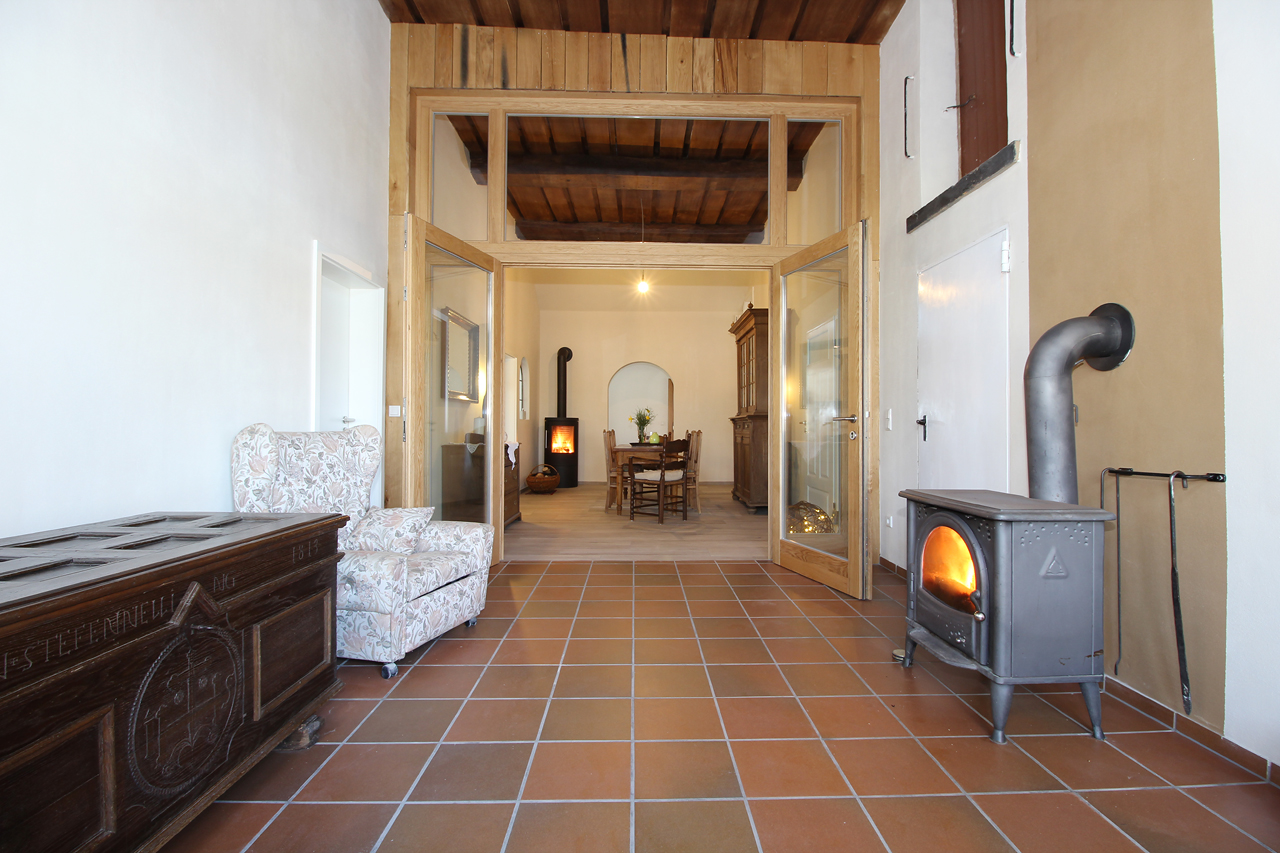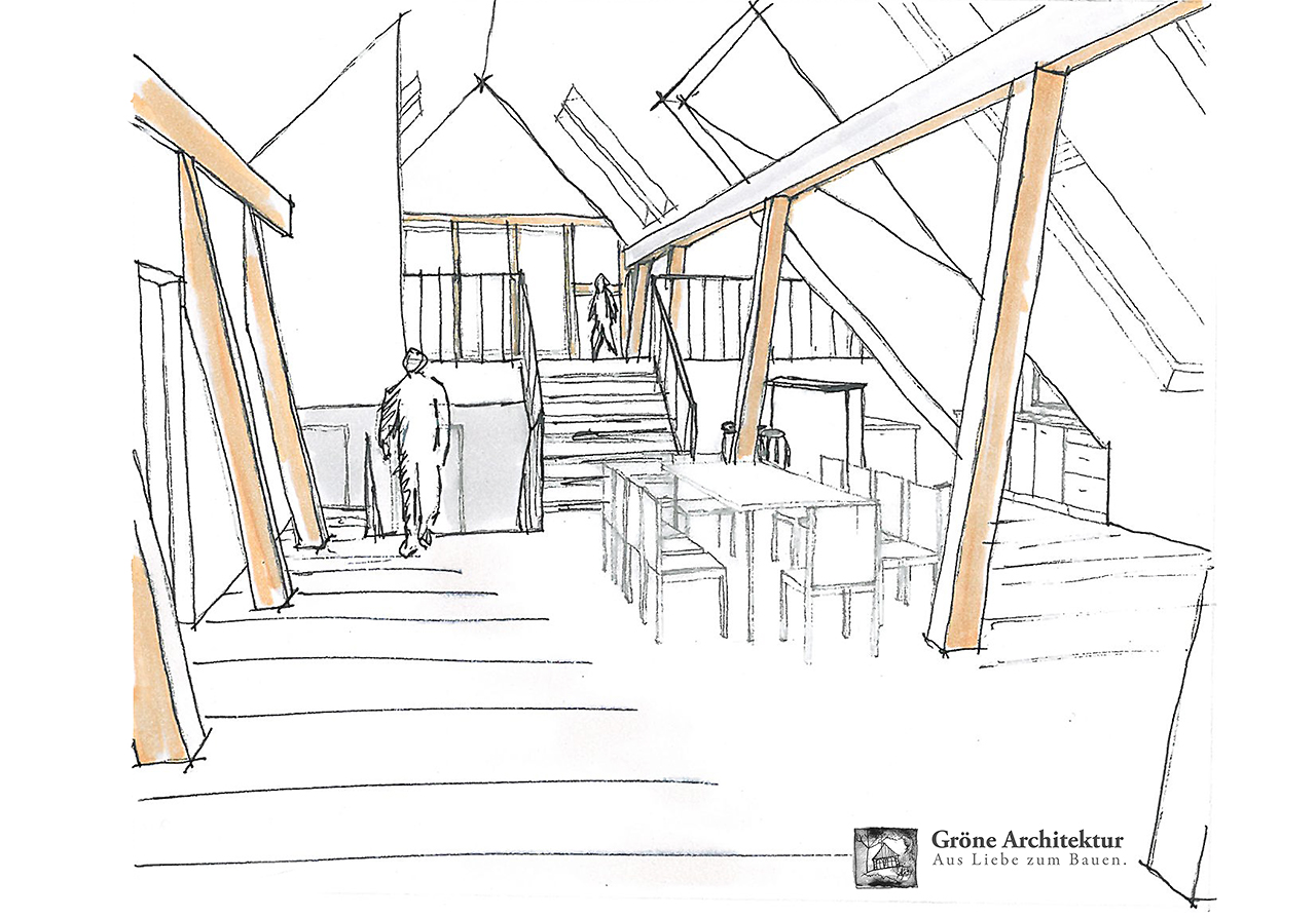 Der Zugang zur Wohnung der jungen Familie erfolgt über die alte Kornkammer im Dachgeschoss. Dort befindet sich der Lebensmittelpunkt der Familie in einem offenen, großzügigen Wohnbereich, in dem Essen, Kochen, Wohnen und Spielen ineinander übergehen. Über eine kurze Treppe gelangt man ins Obergeschoss, wo sich die privaten Räume, wie Bad, Schlaf- und Kinderzimmer, angliedern.