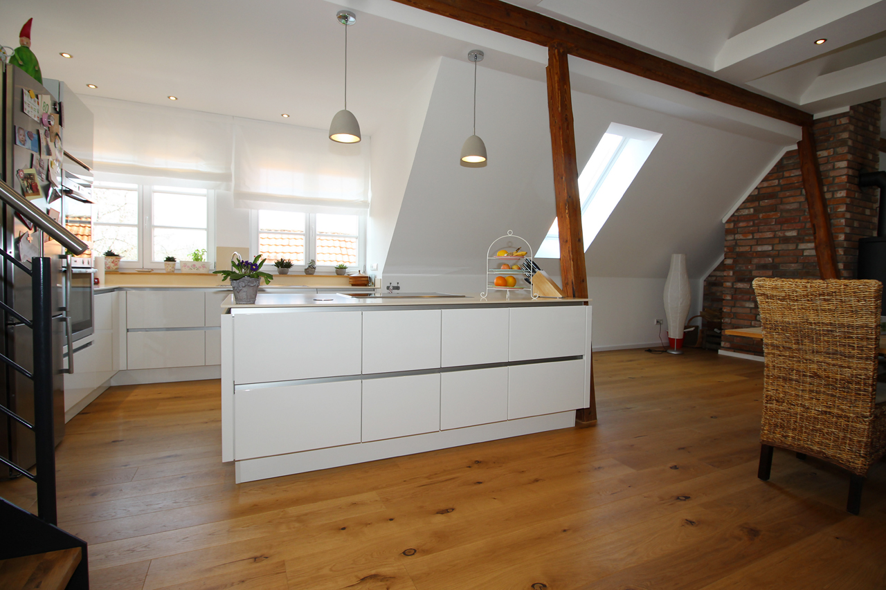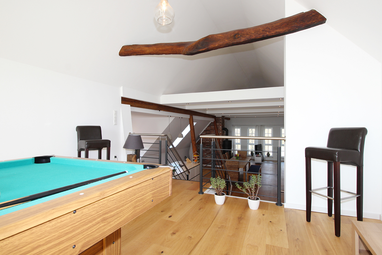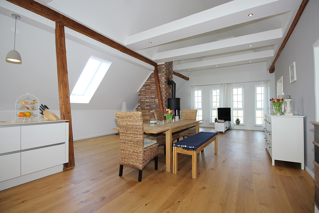 Der Zugang zur Wohnung der jungen Familie erfolgt über die alte Kornkammer im Dachgeschoss. Dort befindet sich der Lebensmittelpunkt der Familie in einem offenen, großzügigen Wohnbereich, in dem Essen, Kochen, Wohnen und Spielen ineinander übergehen. Über eine kurze Treppe gelangt man ins Obergeschoss, wo sich die privaten Räume, wie Bad, Schlaf- und Kinderzimmer, angliedern.
