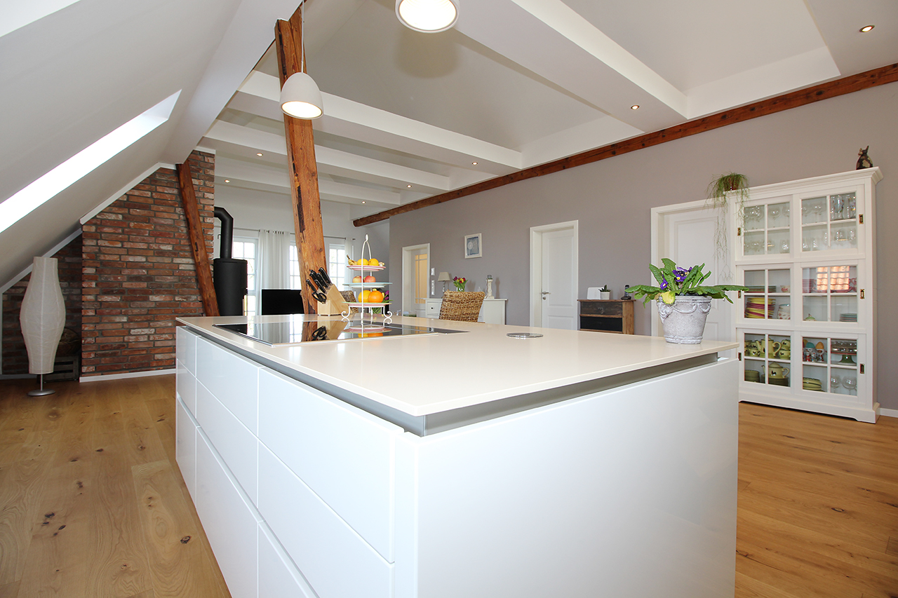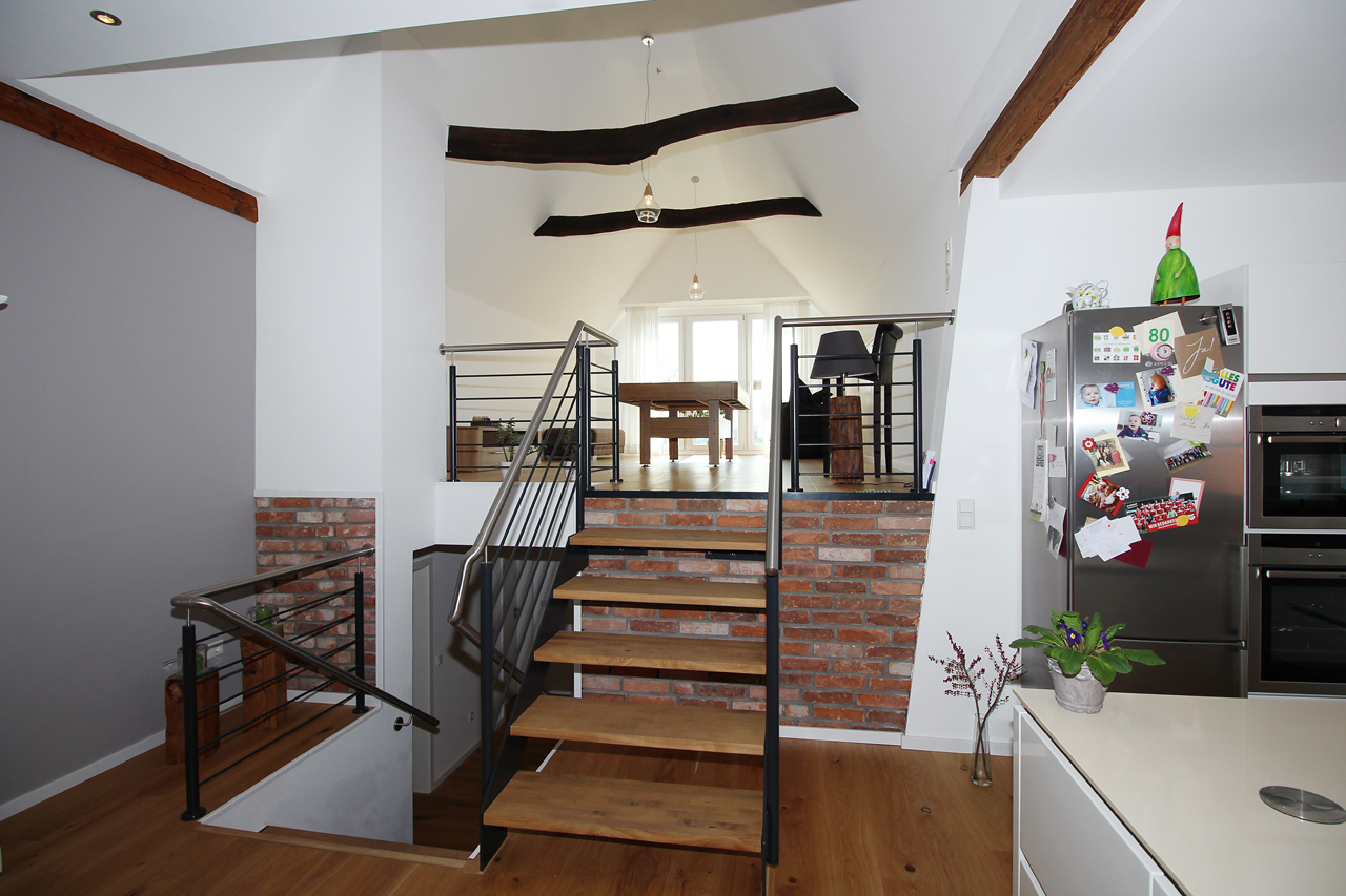Es erfolgte ein kompletter Umbau am bestehenden Wohnhaus, der die alte Kornkammer, das ehemalige Stallgebäude und das Dachgeschoss mit einschließt. Durch diesen Umbau wurden zwei voneinander getrennte Wohneinheiten geschaffen. Heute bewohnt die ältere Generation das Erdgeschoss mit neu gestalteter offener Deele und die Hälfte des Obergeschosses, während die junge Familie die andere Hälfte des Obergeschosses und das Dachgeschoss bezogen hat.